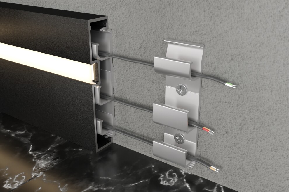 Размер 80x15 мм. Встраивается под 15 мм ГКЛ или штукатурку. Цвет - серебро. Плинтус встроенный в стену - это стиль современных дизайнеров, который удивит своим изыском любого гостя. С подсветкой алюминиевый плинтус используется не только в квартирах, загородных домах и других жилых помещениях, но и в офисах, бизнес центрах и кинотеатрах. Светодиодная подсветка стен также также используется со встроенным плинтусом в стену, используя его уже как просто профиль для светодиодной ленты. Алюминиевые крепежные клипсы при таком варианте не используются, профиль надежно клеится на жидкие гвозди. Также можно использовать двустороннюю клейкую ленту, рекомендуем использовать производителя 3М. Рассеиватель входит в комплект и бывает матовый или прозрачный. Плинтус изначально анодированный под цвет серебра, но также красится в любой цвет по палитре RAL. Имеется в продаже универсальная фурнитура, которая тоже может краситься в цвет плинтуса при необходимости.