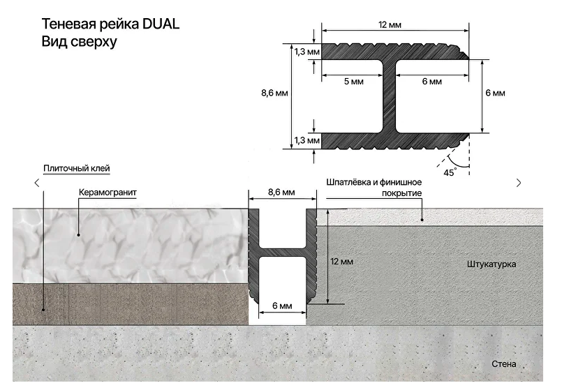 Декоративный разделительный профиль для стен и потолка. С помощью теневой рейки можно изменить геометрию помещения, создать дополнительную фактуру стен и зонировать пространство. Профиль создает теневой шов глубиной 5 или 6 мм. Теневая рейка DUAL идеально стыкуется с теневым плинтусом Laconistiq, создавая общую концепцию современного интерьера. Монтажная вставка FLEX поставляется в комплекте.