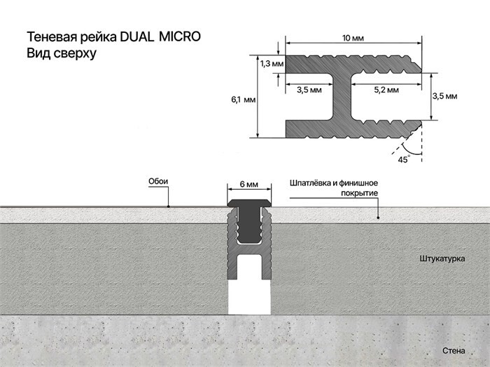 Теневая рейка DUAL mini , это универсальный декоративно-разделительный профиль имеющий обширную зону применения. С помощью данной модель можно перейти из керамогранита, или его имитации в краску или декоративную штукатурку в одной плоскости через объемную теневую линию, что позволяет сделать переход максимально деликатным и не заметным глазу. Монтажная вставка FLEX поставляется в комплекте.