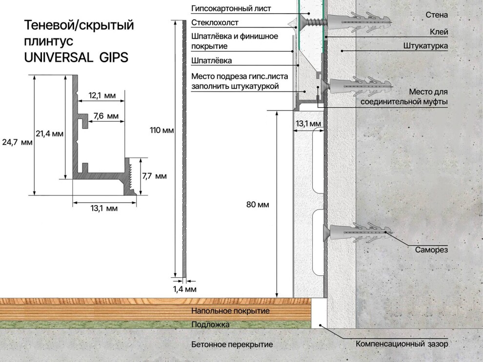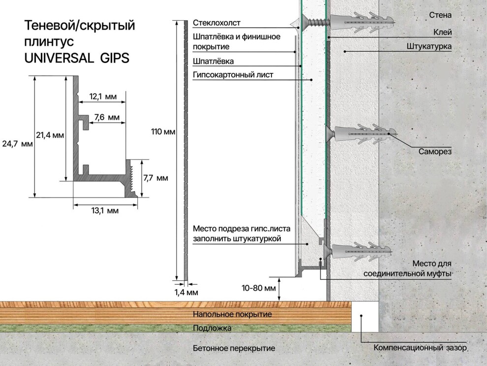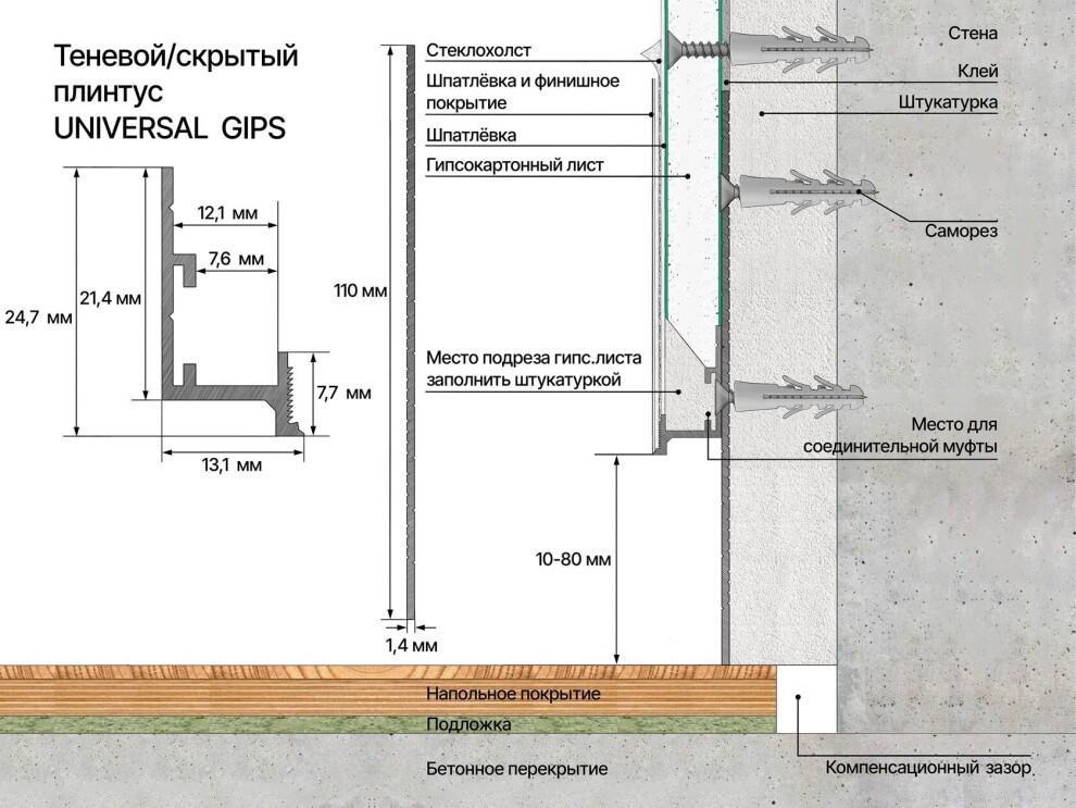 Регулируемый теневой профиль Лаконистик cоздан для работы с поверхностями под покраску, декоративную штукатурку и обои. Кроме того имеет возможность сопряжения с декоративной планкой высотой до 80 мм и шириной до 13 мм по принципу скрытого плинтуса.
