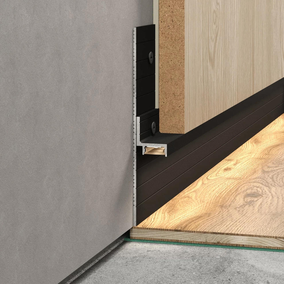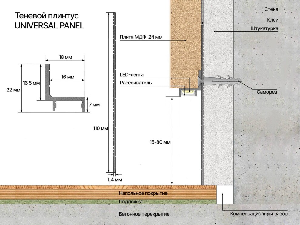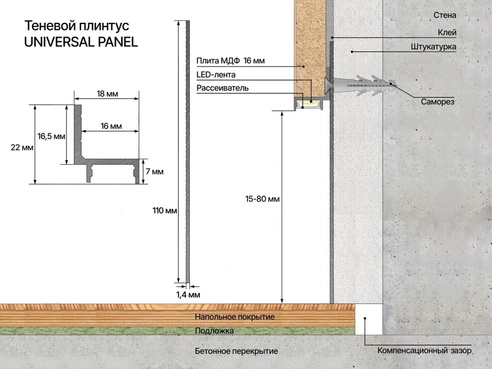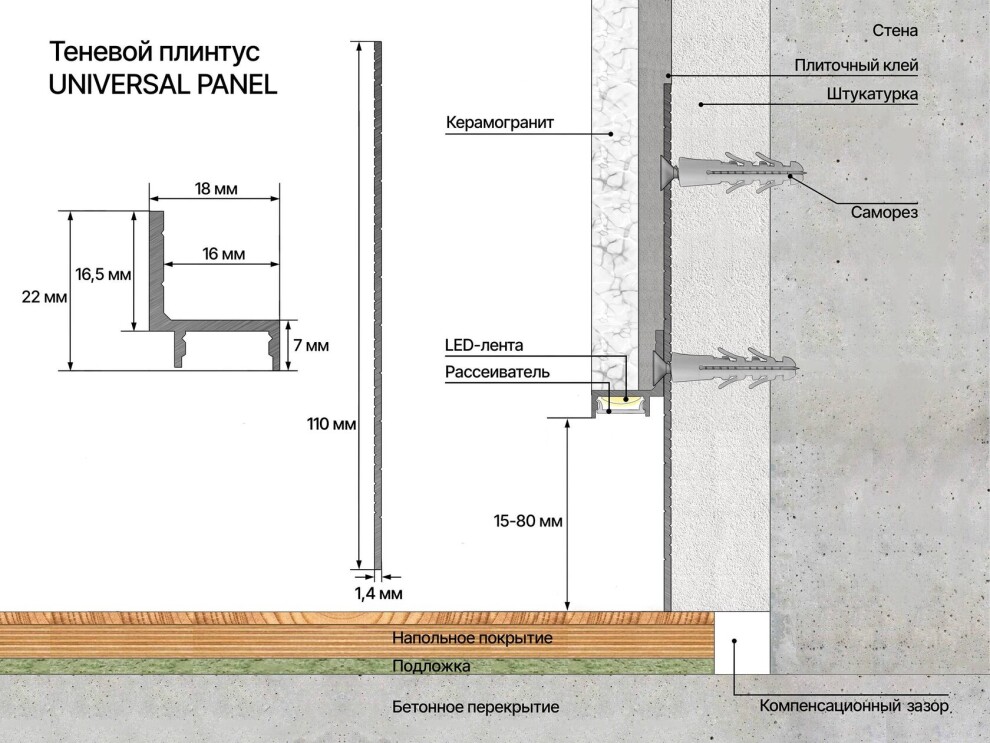 Регулируемый теневой профиль Лаконистик создан для работ с панелями, керамогранитом, стеклом и другими листовыми финишными материалами любой толщины. Имеет рельс с для установки рассеивателя и LED ленты.